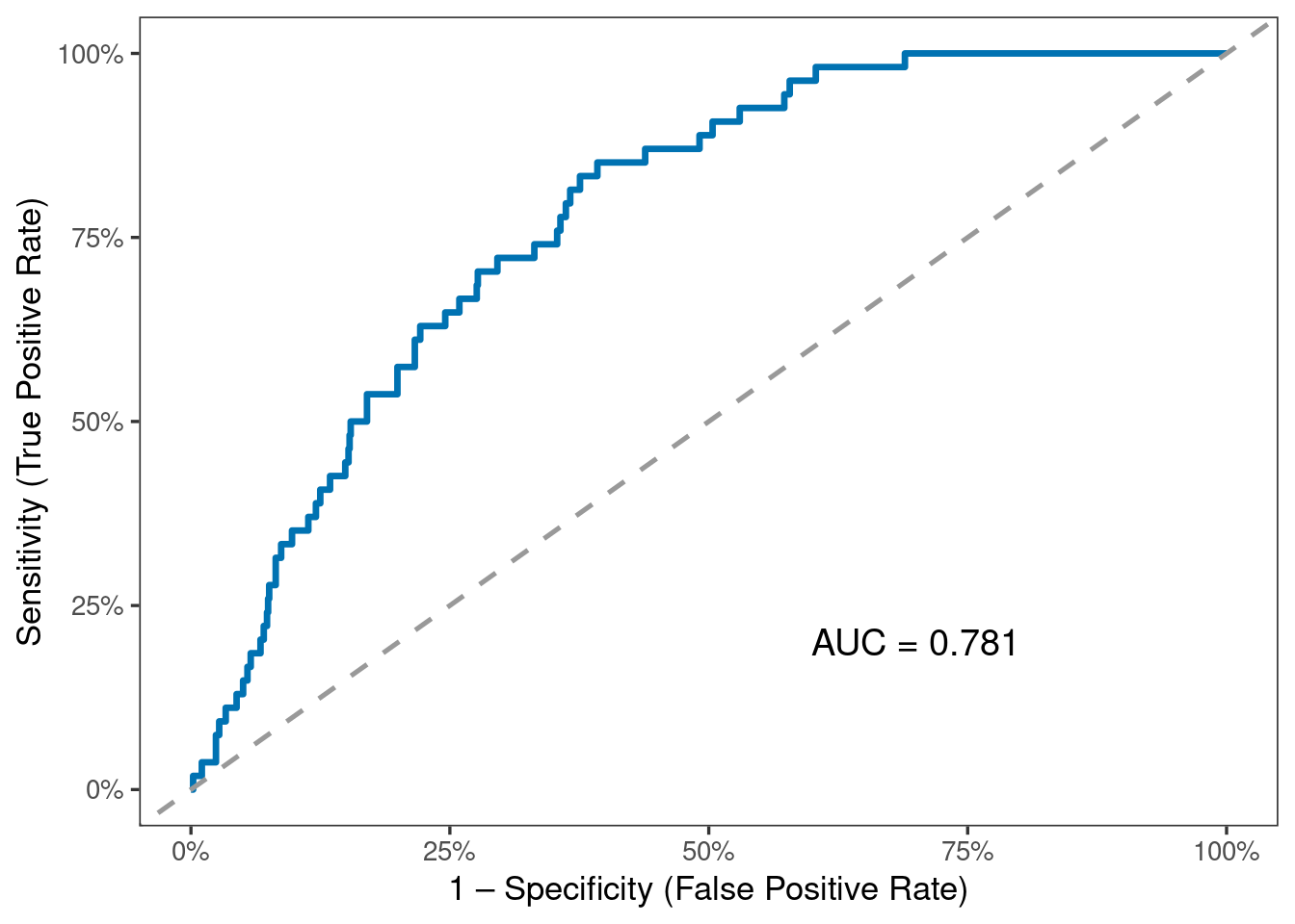 # Odds ratios and 95% confidence intervalscoef_est <-coef(model_lr)OR <-exp(coef_est)conf_int <-exp(confint(model_lr)) # confidence intervals on OR scale# conf_int <- confint(model_lr, level=0.95)odds_table <-cbind(OR, conf_int)colnames(odds_table) <-c("OR", "2.5 %", "97.5 %")round(odds_table, 3)