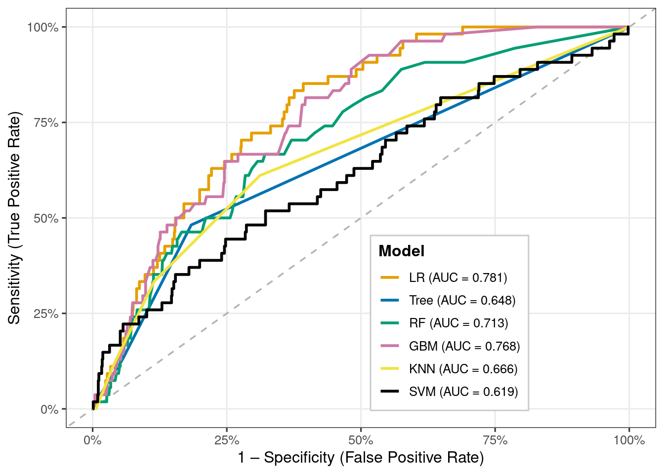 # 1. Create ROC objects for each modelroc_list <-list(LR =roc(test_data$stroke,predict(model_lr2, test_data, type ="prob")[, "Yes"],levels =c("No","Yes"), direction ="<"),Tree =roc(test_data$stroke,predict(model_tree, test_data, type ="prob")[, "Yes"],levels =c("No","Yes"), direction ="<"),RF =roc(test_data$stroke,predict(model_rf, test_data, type ="prob")[, "Yes"],levels =c("No","Yes"), direction ="<"),GBM =roc(test_data$stroke,predict(model_gbm, test_data, type ="prob")[, "Yes"],levels =c("No","Yes"), direction ="<"),KNN =roc(test_data$stroke,predict(model_knn, test_data, type ="prob")[, "Yes"],levels =c("No","Yes"), direction ="<"),SVM =roc(test_data$stroke,predict(model_svm, test_data, type ="prob")[, "Yes"],levels =c("No","Yes"), direction ="<"))# 2. AUC valuesauc_vals <-sapply(roc_list, auc)# 3. Long data frame of ROC coordinatesroc_df <-do.call(rbind, lapply(names(roc_list), function(m) { r <- roc_list[[m]]data.frame(model = m,specificity =rev(r$specificities),sensitivity =rev(r$sensitivities) )}))# Treat model as factor in a consistent orderroc_df$model <-factor(roc_df$model, levels =names(roc_list))# 4. Legend labels with AUClabel_map <-paste0(names(auc_vals), " (AUC = ", sprintf("%.3f", auc_vals), ")")names(label_map) <-names(auc_vals)# 5. Color palette by short model namemodel_cols <-c(LR ="#E69F00",Tree ="#0072B2",RF ="#009E73",GBM ="#CC79A7",KNN ="#F0E442",SVM ="#000000")# 6. Plotp3 <-ggplot(roc_df, aes(x =1- specificity, y = sensitivity,colour = model, group = model)) +geom_abline(intercept =0, slope =1,linetype ="dashed", colour ="grey70", linewidth =0.6) +geom_line(linewidth =1) +scale_color_manual(values = model_cols,breaks =names(label_map),labels = label_map,name ="Model" ) +scale_x_continuous(labels =percent_format(accuracy =1)) +scale_y_continuous(labels =percent_format(accuracy =1)) +labs(x ="1 – Specificity (False Positive Rate)",y ="Sensitivity (True Positive Rate)" ) +theme_bw(base_size =12) +theme(legend.position =c(0.65, 0.25),legend.background =element_rect(fill ="white", colour ="grey80"),legend.title =element_text(face ="bold"),panel.grid.minor =element_blank() )