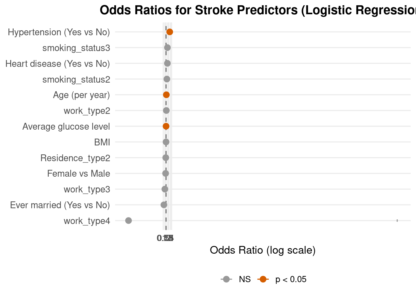 # Fit logistic regression on the same train_data used in the ML comparison# makes not sense# glm_lr <- glm(# stroke ~ age + gender + hypertension + heart_disease + ever_married + work_type + Residence_type + avg_glucose_level + bmi + smoking_status,# data = train_data,# family = binomial# )# Coefficients, CIs, p-valueslr_coef <-summary(model_lr)$coefficients # estimates + p-valuesci_raw <-suppressMessages(confint(model_lr)) # CI on log-odds scaleor_df <-data.frame(Predictor =rownames(lr_coef),logOR = lr_coef[, "Estimate"],OR =exp(lr_coef[, "Estimate"]),CI_lower =exp(ci_raw[, 1]),CI_upper =exp(ci_raw[, 2]),p_value = lr_coef[, "Pr(>|z|)"]) %>%# remove interceptfilter(Predictor !="(Intercept)") %>%# nicer labels for the plotmutate(Label = dplyr::recode(Predictor,age ="Age (per year)",gender ="Female vs Male",hypertension ="Hypertension (Yes vs No)",heart_disease ="Heart disease (Yes vs No)",ever_married ="Ever married (Yes vs No)",work_type ="Work type (higher level)",Residence_type ="Residence: Rural vs Urban",avg_glucose_level ="Average glucose level",bmi ="BMI",smoking_status ="Smoking status (higher level)"),# significance flag for colourSig =ifelse(p_value <0.05, "p < 0.05", "NS")) %>%# order from lower to higher OR so the plot reads nicelyarrange(OR) %>%mutate(Label =factor(Label, levels = Label))# Forest plotp4 <-ggplot(or_df, aes(x = Label, y = OR, colour = Sig)) +geom_hline(yintercept =1, linetype ="dashed", colour ="grey40") +geom_errorbar(aes(ymin = CI_lower, ymax = CI_upper),width =0.15, linewidth =0.6) +geom_point(size =3) +coord_flip() +scale_y_log10(breaks =c(0.5, 0.75, 1, 1.5, 2, 3, 4),labels =c("0.5", "0.75", "1", "1.5", "2", "3", "4")) +scale_colour_manual(values =c("p < 0.05"="#D55E00", "NS"="#999999")) +labs(title ="Odds Ratios for Stroke Predictors (Logistic Regression)",x =NULL,y ="Odds Ratio (log scale)",colour =NULL) +theme_minimal(base_size =13) +theme(panel.grid.minor =element_blank(),plot.title =element_text(face ="bold", hjust =0.5, size =15),axis.text.y =element_text(size =11),legend.position ="bottom")