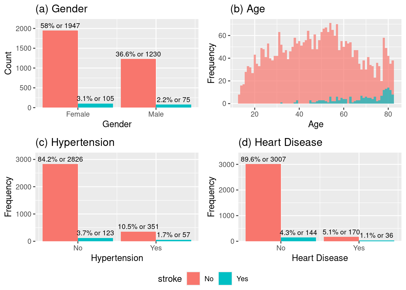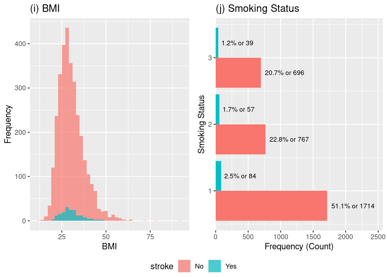 # 1. Get the total number of rows in your data frameTOTAL_ROWS <-nrow(strokeclean)# 2. Use the modified ggplot codep1a <-ggplot(strokeclean, aes(x = gender, fill = stroke)) +geom_bar(position ="dodge") +stat_count(# The calculation is (bar_count / TOTAL_ROWS) * 100, rounded to 1 decimal place.position =position_dodge(width =0.9),aes(label =paste0(round(after_stat(count) / TOTAL_ROWS *100, 1), "% ", "or ",after_stat(count) ) ),geom ="text",vjust =-0.5,size =3 ) +scale_y_continuous(expand =expansion(mult =c(0, 0.15))) +scale_x_continuous(breaks =c(0, 1), labels =c("Female", "Male") ) +labs(title ="(a) Gender", x ="Gender", y ="Count")# (b) Histogram of Agep1b <-ggplot(strokeclean, aes(x = age, fill = stroke)) +geom_histogram(binwidth =1, position ="identity", alpha =0.7) +# stat_count(aes(label = ..count..), geom = "text", vjust = -0.5, size = 2) +labs(title ="(b) Age", x ="Age", y ="Frequency")# (b) Bivariate Density Plot of Age# p1b <- ggplot(strokeclean, aes(x = age, fill = stroke)) + # Keep fill=stroke# geom_density(alpha = 0.5) + # Overlap the two density curves# labs(title = "(b) Age", x = "Age", y = "Density")# (c) Histogram of hypertensionp1c <-ggplot(strokeclean, aes(x = hypertension, fill = stroke)) +geom_bar(position ="dodge") +stat_count(position =position_dodge(width =0.9),aes(group = stroke,label =paste0(round(after_stat(count) / TOTAL_ROWS *100, 1), "% ", "or ",after_stat(count) ) ),geom ="text",vjust =-0.5,size =3 ) +scale_y_continuous(expand =expansion(mult =c(0, 0.15))) +# Map 0/1 to Yes/Noscale_x_continuous(breaks =c(0, 1),labels =c("No", "Yes") ) +labs(title ="(c) Hypertension", x ="Hypertension", y ="Frequency")# (d) Histogram of heart_diseasep1d <-ggplot(strokeclean, aes(x = heart_disease, fill = stroke)) +geom_bar(position ="dodge") +stat_count(position =position_dodge(width =0.9),aes(group = stroke,label =paste0(round(after_stat(count) / TOTAL_ROWS *100, 1), "% ", "or ",after_stat(count) ) ),geom ="text",vjust =-0.5,size =3 ) +scale_y_continuous(expand =expansion(mult =c(0, 0.15))) +# Map 0/1 to Yes/Noscale_x_continuous(breaks =c(0, 1),labels =c("No", "Yes") ) +labs(title ="(d) Heart Disease", x ="Heart Disease", y ="Frequency")# (e) Histogram of ever_marriedp1e <-ggplot(strokeclean, aes(x = ever_married, fill = stroke)) +geom_bar(position ="dodge") +stat_count(position =position_dodge(width =0.9),aes(group = stroke,label =paste0(round(after_stat(count) / TOTAL_ROWS *100, 1), "% ", "or ",after_stat(count) ) ),geom ="text",vjust =-0.5,size =3 ) +scale_y_continuous(expand =expansion(mult =c(0, 0.15))) +scale_x_continuous(breaks =c(0, 1),labels =c("No", "Yes") ) +# Assuming 'No'/'Yes' are string/factor values, use scale_x_discrete if neededlabs(title ="(e) Ever Married", x ="Ever Married", y ="Frequency")# (f) Histogram of work_typep1f <-ggplot(strokeclean, aes(y = work_type, fill = stroke)) +geom_bar(position ="dodge") +stat_count(position =position_dodge(width =0.9), aes(group = stroke,label =paste0(round(after_stat(count) / TOTAL_ROWS *100, 1), "% ", "or ",after_stat(count) ) ),geom ="text",hjust =-0.1, # Shift text right for horizontal barsize =3,color ="black" ) +# Expand X-axis (Frequency) for horizontal barscale_x_continuous(expand =expansion(mult =c(0, 0.5))) +# Adding Work type labels make it too convoluted# scale_y_continuous(# breaks = c(1, 2, 3, 4), # labels = c("Govt_job", "Private", "Self-employed", "Never_worked")# ) + labs(title ="(f) Work Type", y ="Work Type", x ="Frequency")# (g) Histogram of Residence_typep1g <-ggplot(strokeclean, aes(x = Residence_type, fill = stroke)) +geom_bar(position ="dodge") +stat_count(# Crucial for aligning text labels with the dodged barsposition =position_dodge(width =0.9), aes(# Defines the group for position_dodge to work correctly on textgroup = stroke, # Combined label: Percentage (top line) + Count (bottom line)label =paste0(# Percentage calculation: (count / TOTAL_ROWS) * 100round(after_stat(count) / TOTAL_ROWS *100, 1), "% ", "or ",after_stat(count) ) ),geom ="text",vjust =-0.5, # Moves the two-line label slightly above the barsize =3,color ="black"# Ensures better visibility ) +# Adds 15% extra space to the top of the y-axis to prevent label clippingscale_y_continuous(expand =expansion(mult =c(0, 0.15))) +scale_x_continuous(breaks =c(1, 2),labels =c("Urban", "Rural") ) +labs(title ="(g) Residence Type", x ="Residence Type", y ="Frequency (Count)")# (h) Histogram of avg_gloucose_levelp1h <-ggplot(strokeclean, aes(x = avg_glucose_level, fill = stroke)) +geom_histogram(binwidth =5, position ="identity", alpha =0.7) +# stat_count(aes(label = ..count..), geom = "text", vjust = -0.5, size = 2) +labs(title ="(h) Avg. Glucose Level", x ="Glucose Level", y ="Frequency")# (h) Bivariate Density plot of avg_gloucose_level# p1h <- ggplot(strokeclean, aes(x = avg_glucose_level, fill = stroke)) +# geom_density(alpha = 0.5) +# labs(title = "Avg. Glucose Level by Stroke Status", x = "Average Glucose Level", y = "Density")# (i) Histogram of bmip1i <-ggplot(strokeclean, aes(x = bmi, fill = stroke)) +geom_histogram(binwidth =2, position ="identity", alpha =0.7) +labs(title ="(i) BMI", x ="BMI", y ="Frequency")# (i) Bivariate Density plot of bmi# p1i <- ggplot(strokeclean, aes(x = bmi, fill = stroke)) +# geom_density(alpha = 0.5) +# labs(title = "BMI Distribution by Stroke Status", x = "BMI", y = "Density")# (j) smoking_statusp1j <-ggplot(strokeclean, aes(y = smoking_status, fill = stroke)) +geom_bar(position ="dodge") +stat_count(position =position_dodge(width =0.9), aes(group = stroke, label =paste0(round(after_stat(count) / TOTAL_ROWS *100, 1), "% ", "or ",after_stat(count) ) ),geom ="text",hjust =-0.1, size =3,color ="black" ) +scale_x_continuous(expand =expansion(mult =c(0, 0.5))) +labs(title ="(j) Smoking Status", y ="Smoking Status", x ="Frequency (Count)")