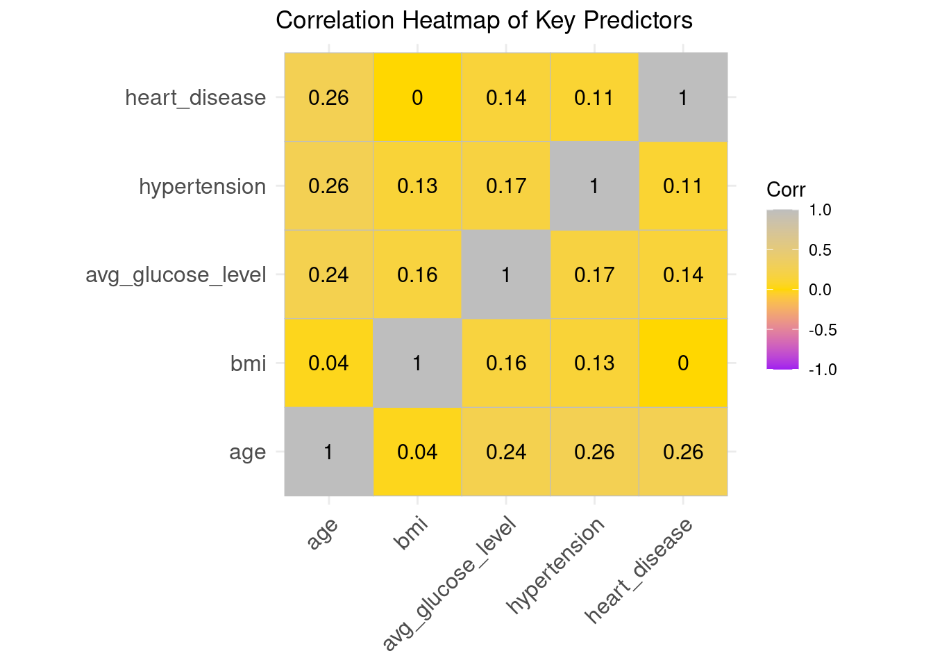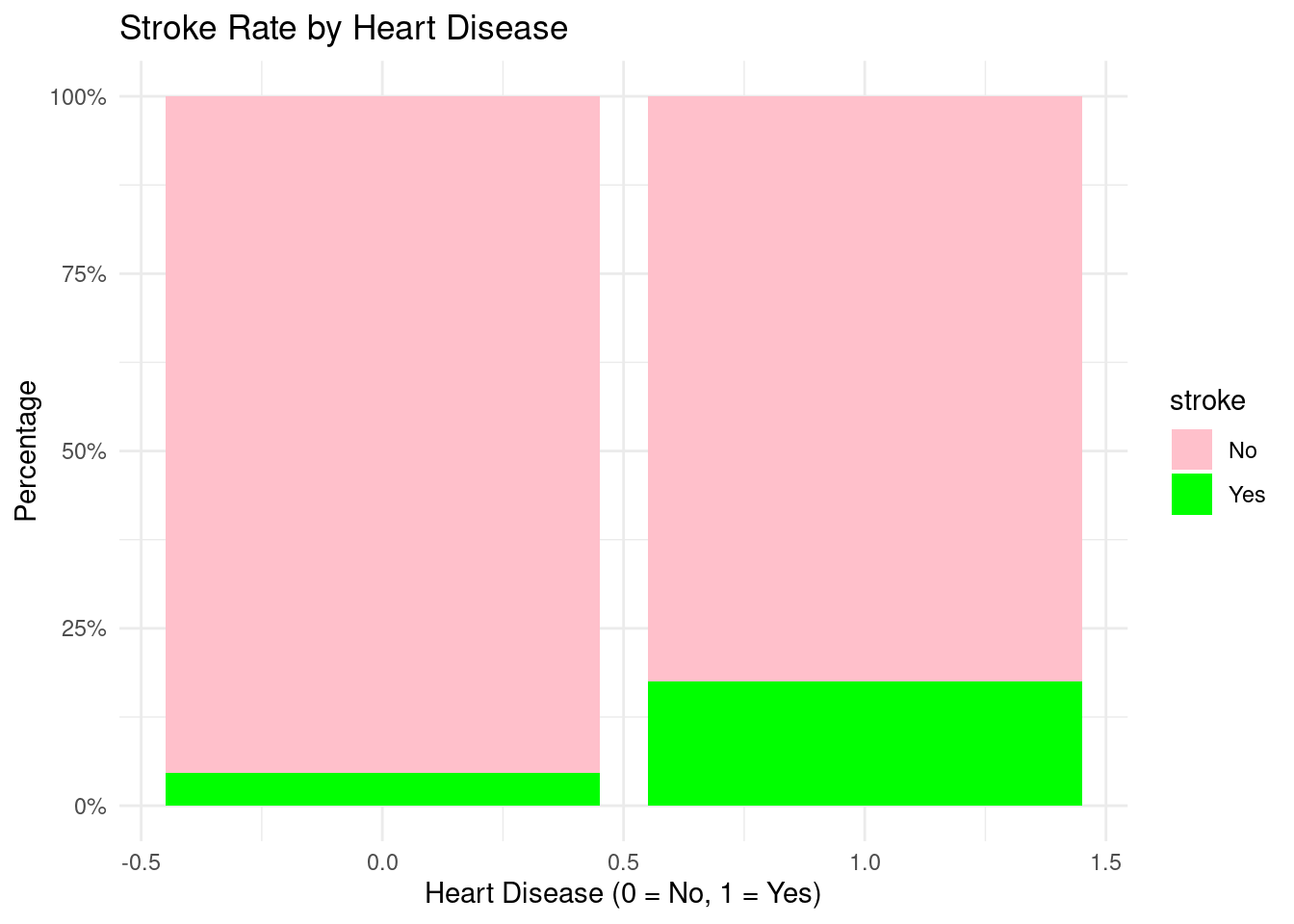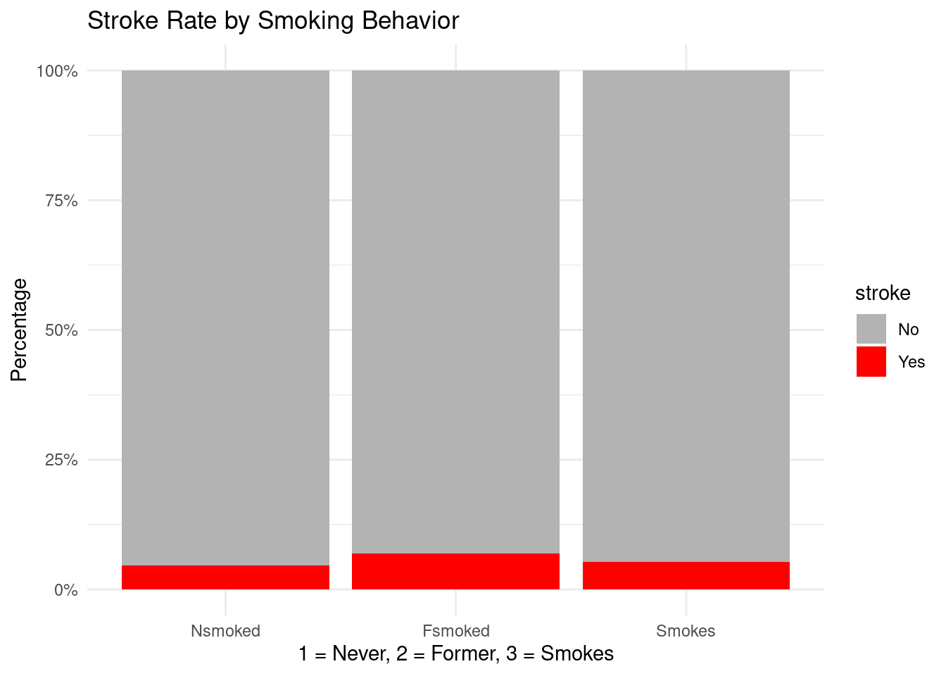 The outcome stroke was defined as a factor with levels “No” and “Yes” in the cleaned dataset strokeclean.