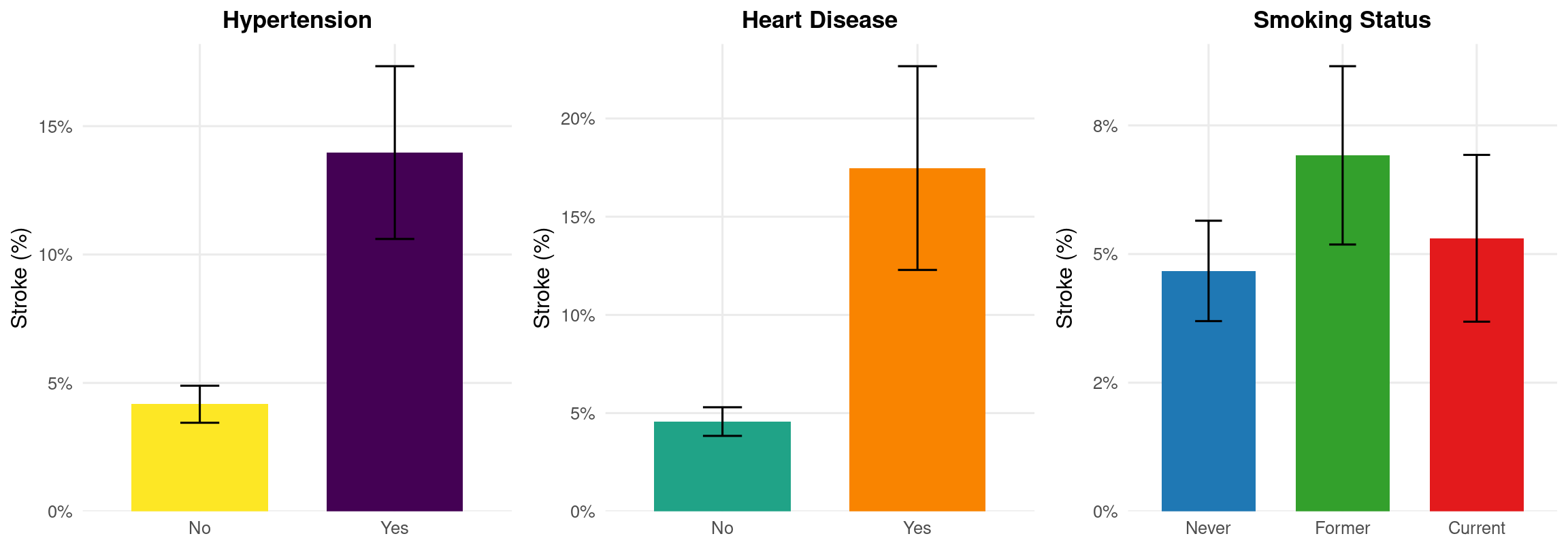 Our datset contains 5,110 observations and 11 predictors commonly associated with cerebrovascular risk. After cleaning missing and inconsistent entries (e.g., “Unknown”, “N/A”, or rare textual categories such as “children” and “other”), a final dataset of 3,357 individuals remained for analysis. The cleaned dataset is stored in the object strokeclean.