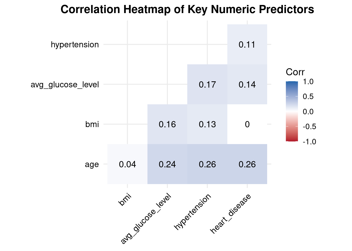 Histograms were used to assess the spread of the primary numeric predictors (Age, BMI, and Average Glucose Level). These variables demonstrate clinically expected right-skewness, particularly glucose and BMI, consistent with published literature on metabolic and cardiovascular risk distributions.