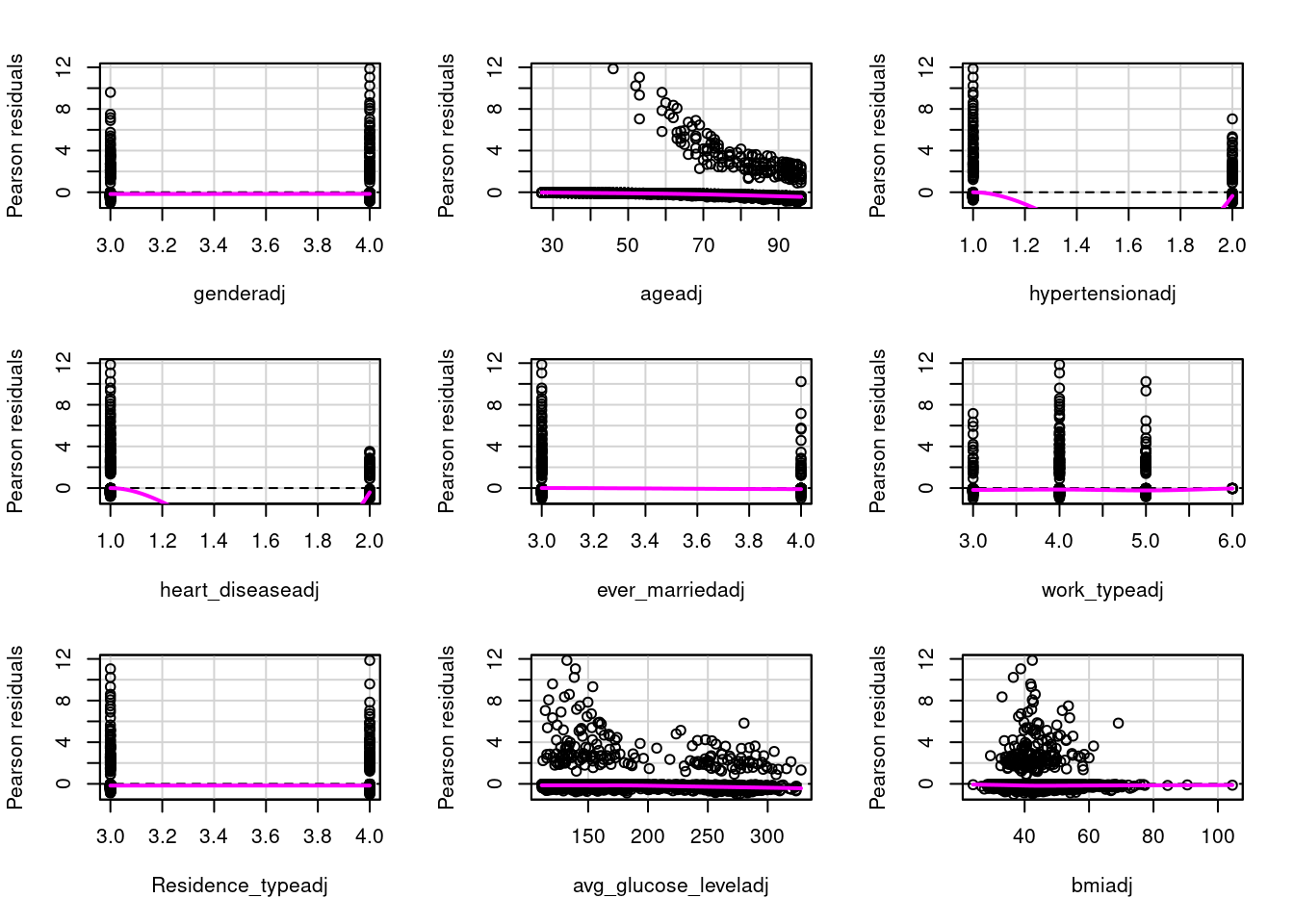 Conclusion: For all continuous variables , ageadj, avg_glucose_leveladj, and bniadj, the residual plots show linearity
